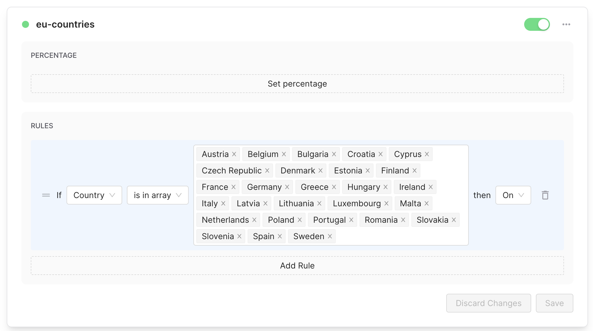 Then we can create a new flag named eu-countries and add the all countries within the EU.
