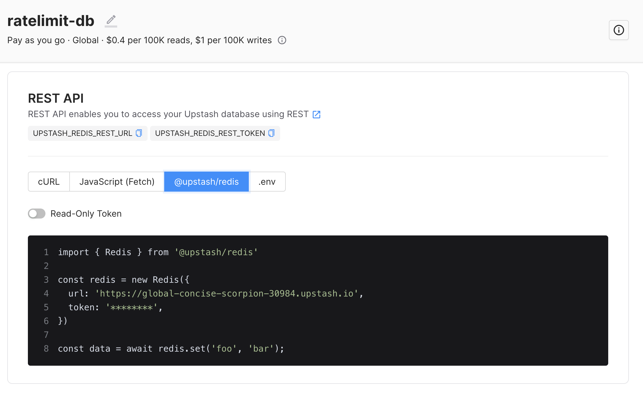 Create a Redis database on Upstash Console or Upstash CLI. UPSTASH_REDIS_REST_URL and UPSTASH_REDIS_REST_TOKEN will be needed for the next steps.