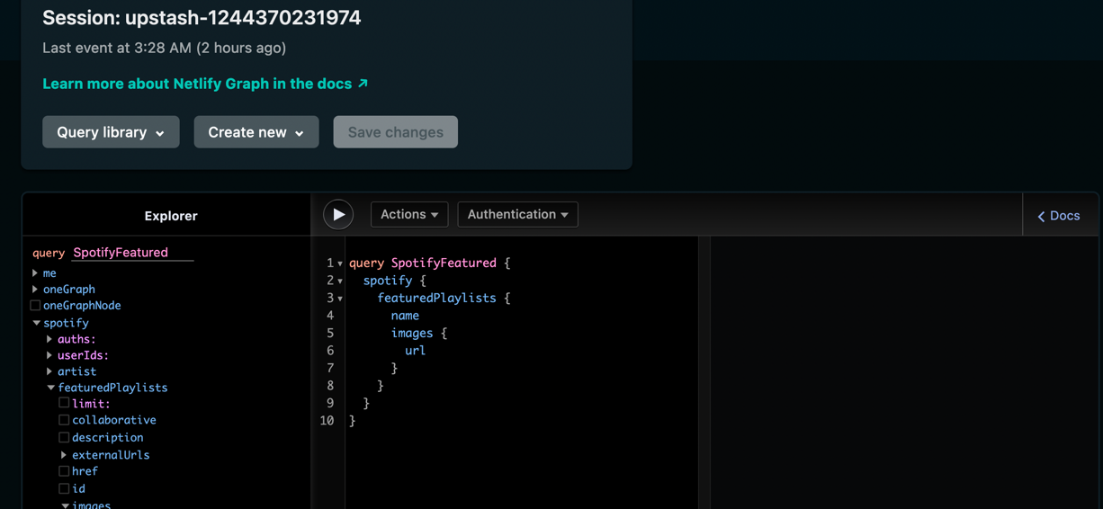 Now we can play with GraphQL Playground. Click the Start querying Spotify button. Now we need to run netlify-cli with following command in the project directory.