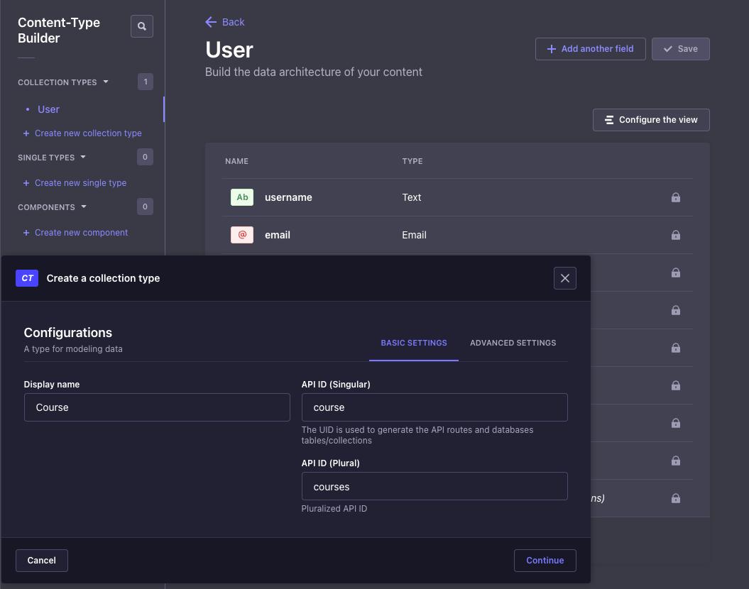 Click on Create new collection type to create a new content type. For this example, we'll create a content type called Course with the following fields: